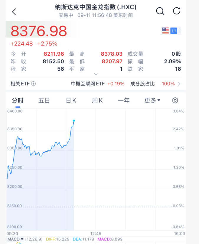 9月11日晚间,中概股指数暴涨近3%,港股两大指数期货夜盘同步大涨超1%。相信周五的A股、港股会有好的表现。